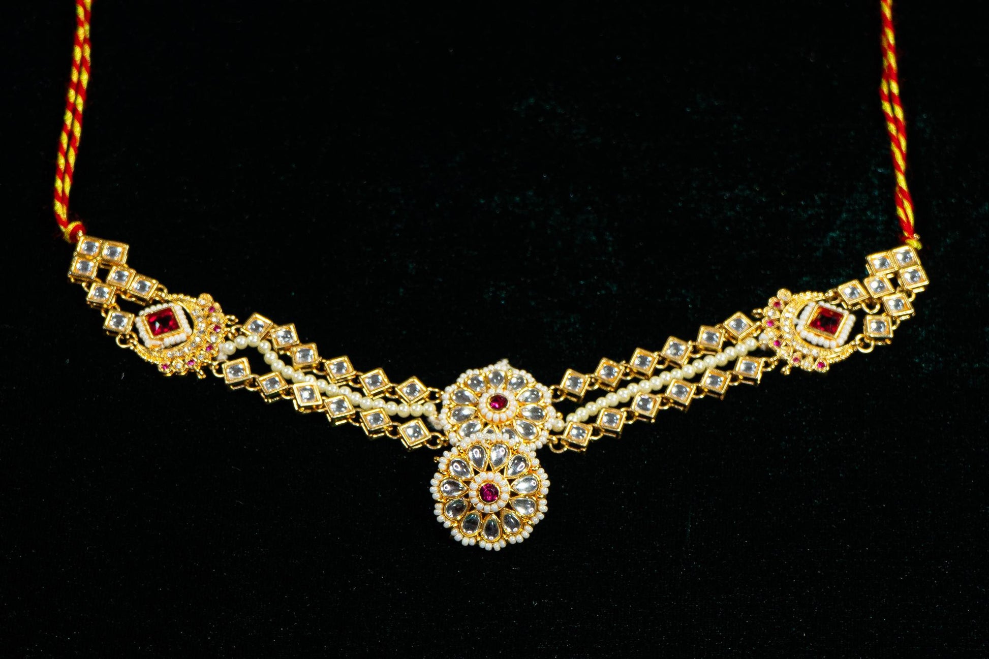 Sophisticated ruby and pearl kundan headpiece.