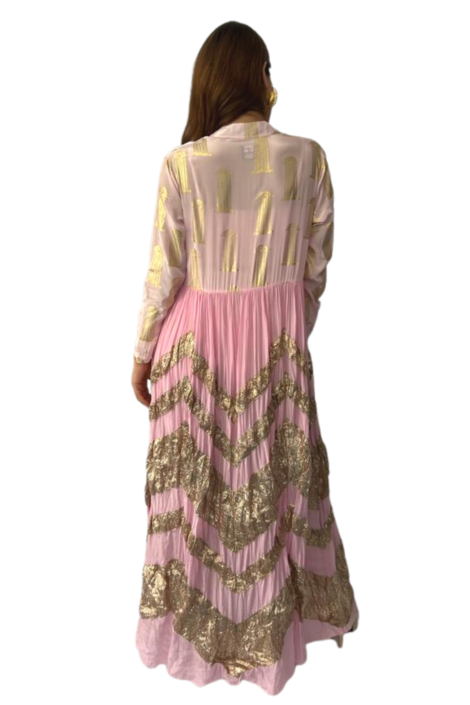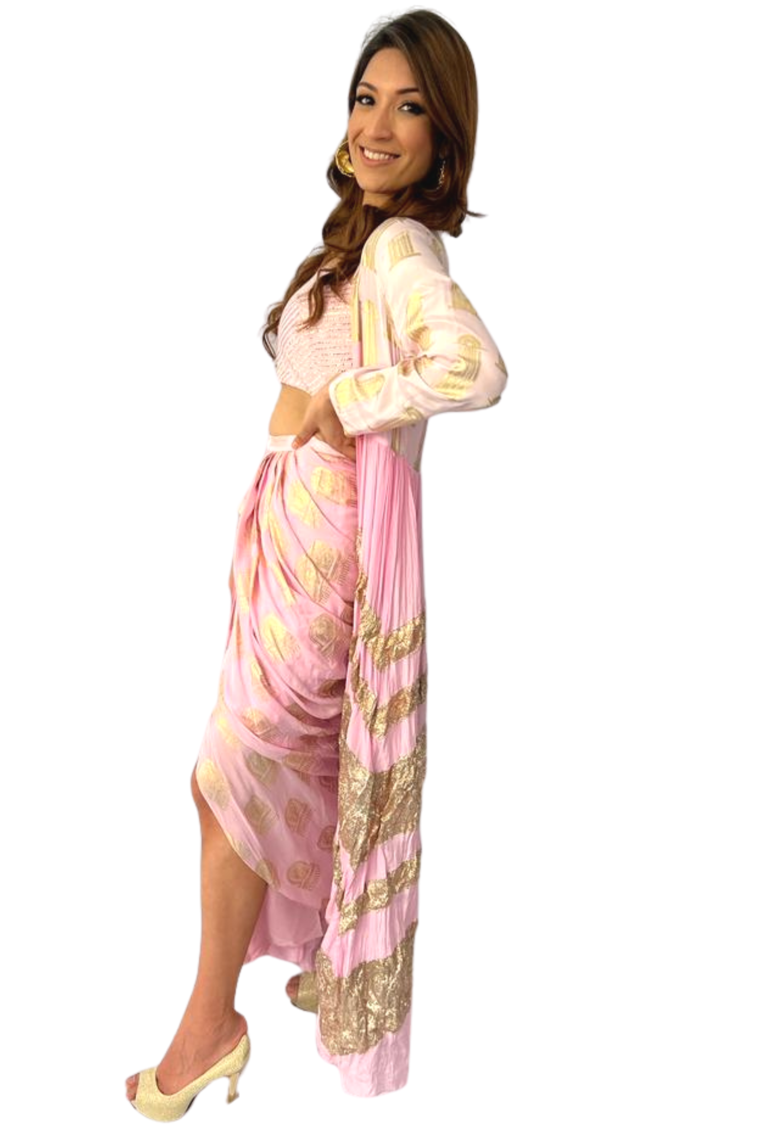The pastel pink and gold outfit comes in three pieces with a cropped top, dhoti draped skirt and matching jacket with gold foil chevron stripes.