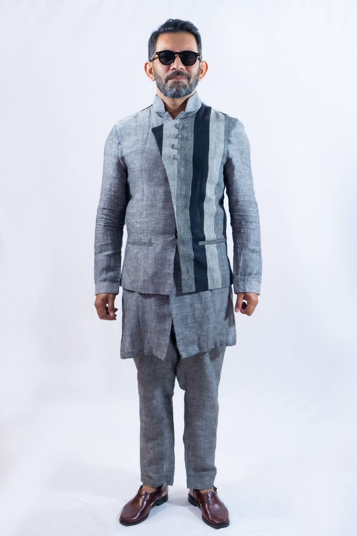 A three piece grey kurta set with monochrome stripe vest, grey kurta shirt with matching pants.