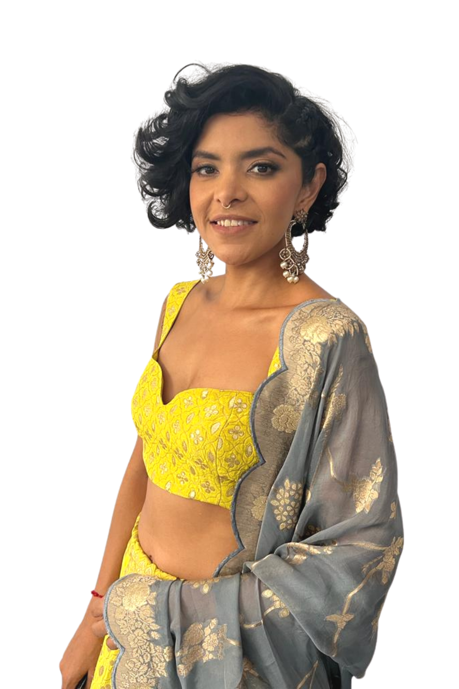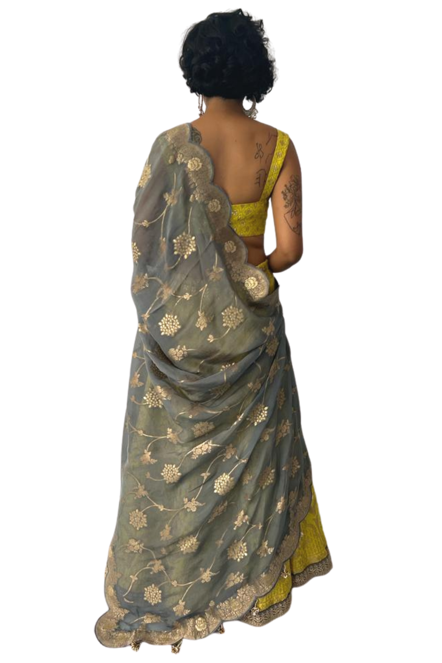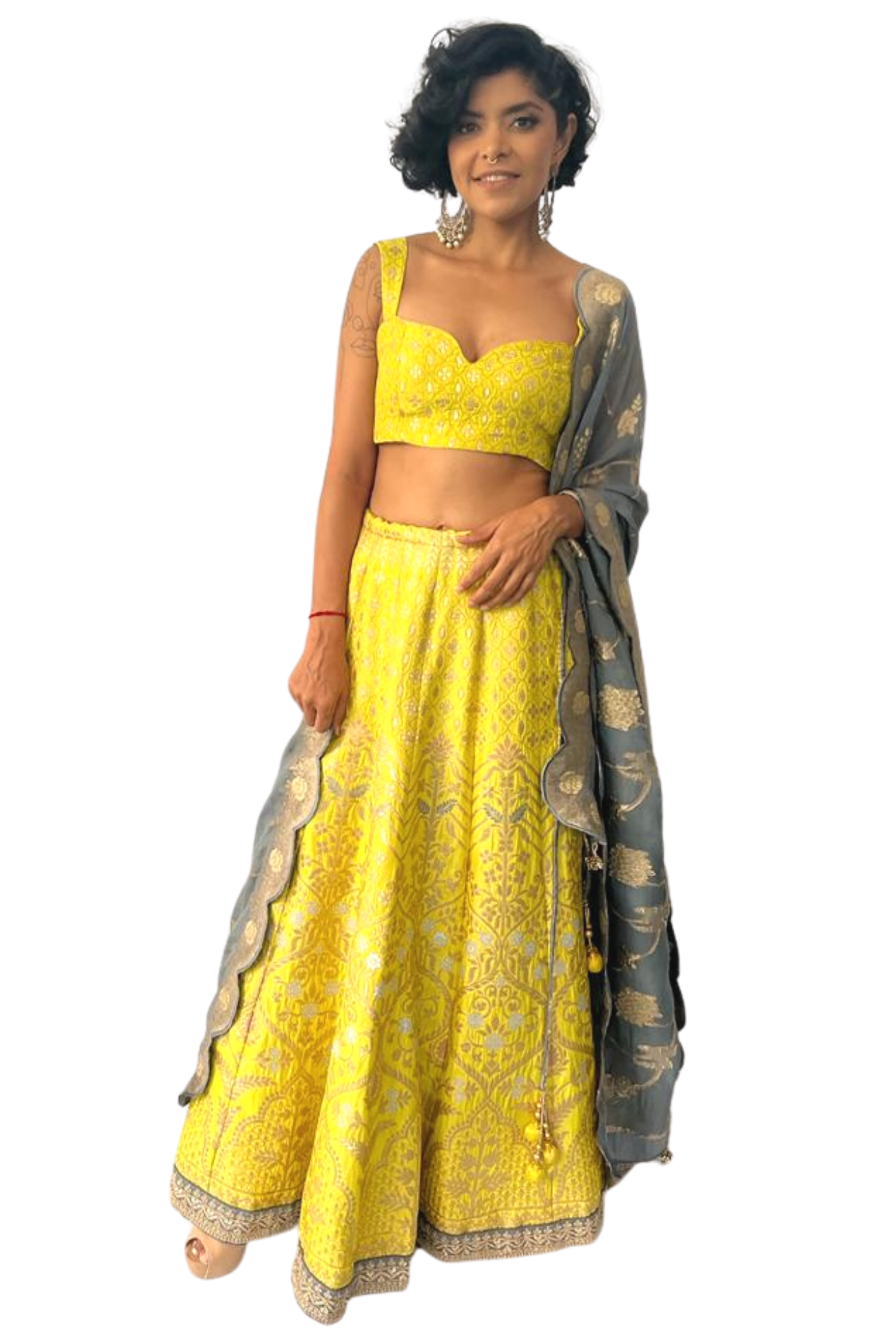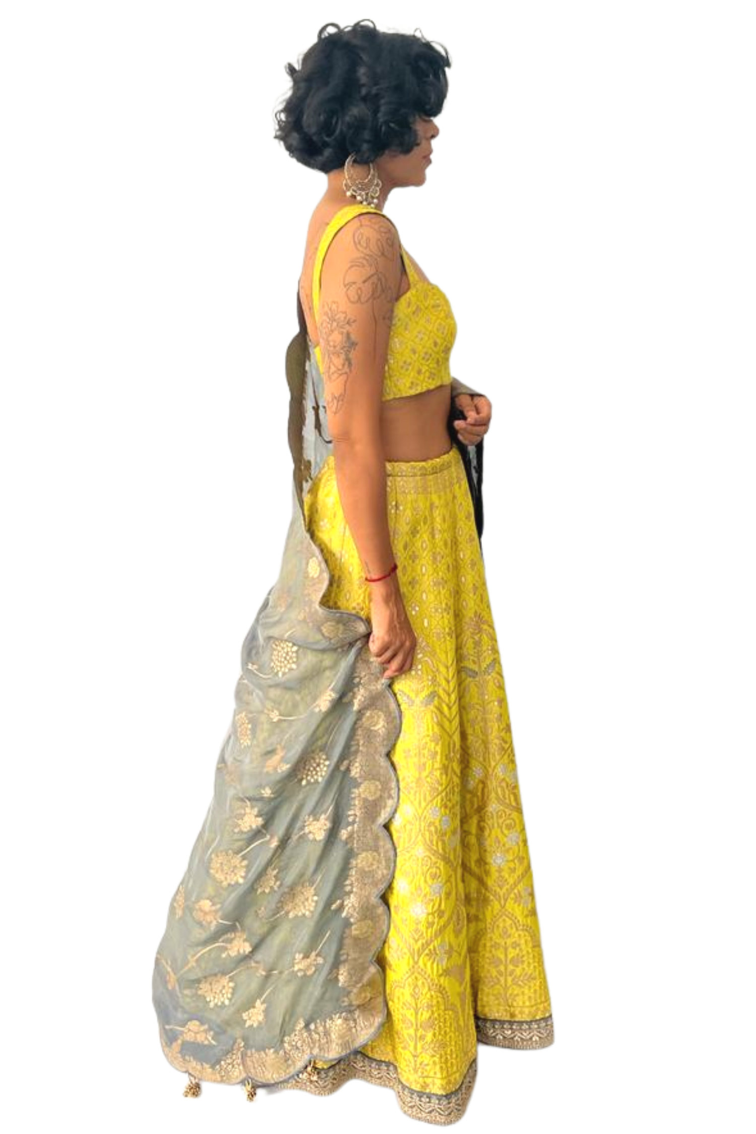 A lime yellow brocade silk lengha that comes in 3 pieces.  This outfit comes with lime cropped top with silver work, matching A-line skirt and contrasting grey scarf with gold detail.