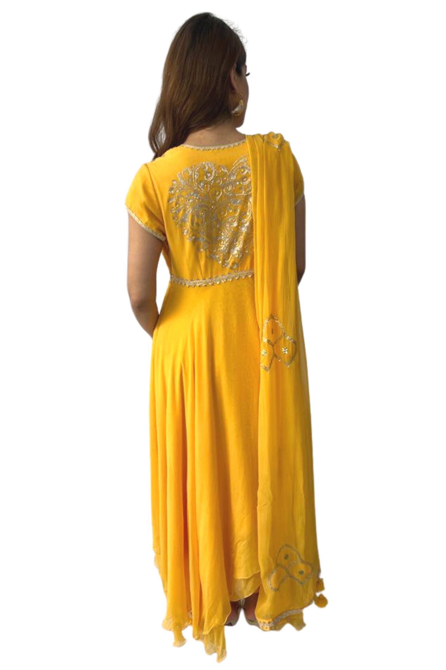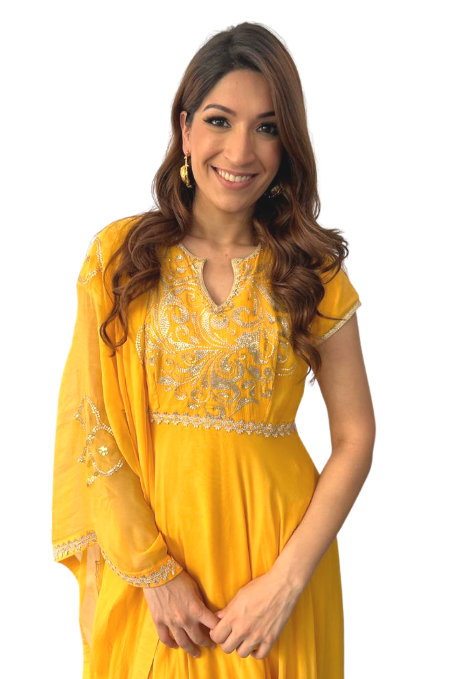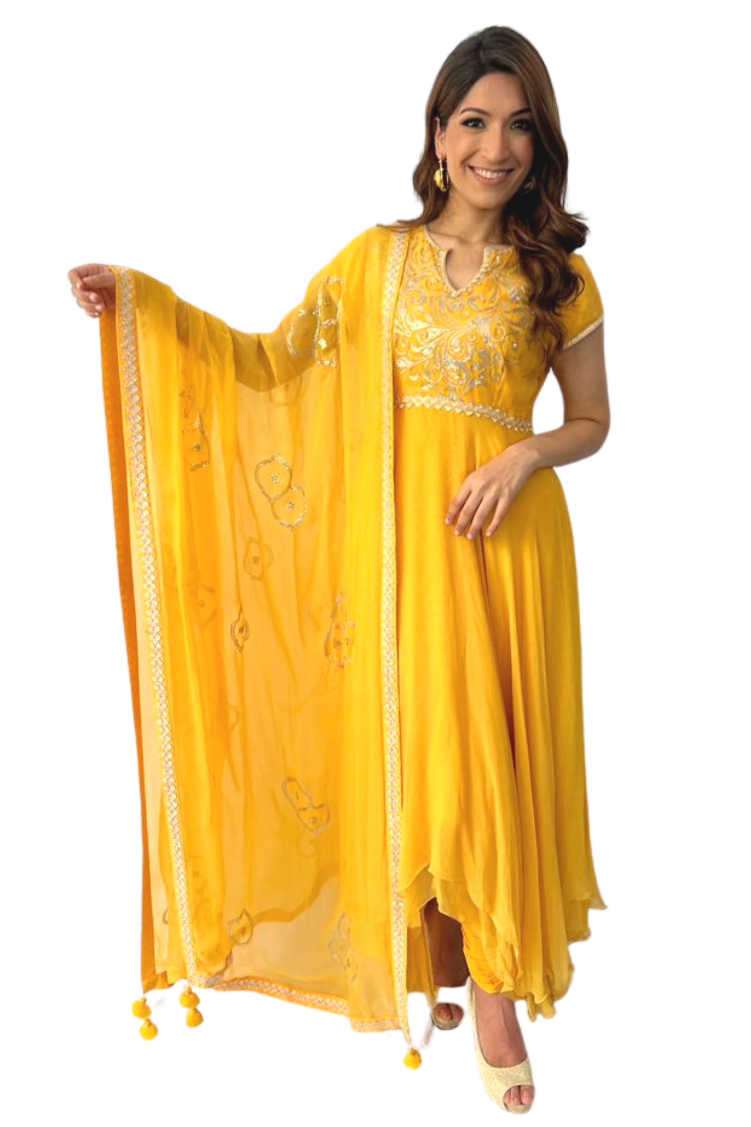 This simple yet elegant anarkali comes in a beautiful yellow with silver patch work design, matching churidar pant and scarf.